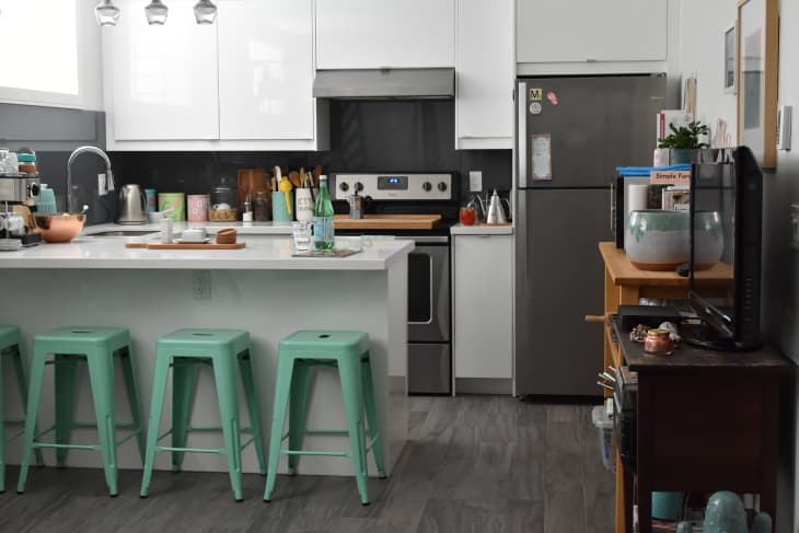 If you're lucky enough to have a large kitchen, you may already have an island in the middle to break up the floor space.